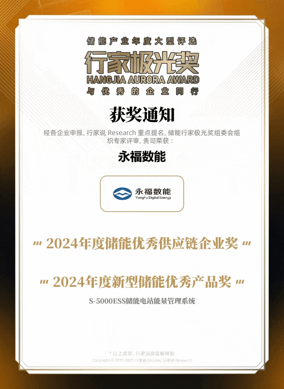 在同期举办的“2025行家极光奖”颁奖典礼上,永福数能凭借其在技术创新、市场拓展及推动行业进步等方面的贡献,斩获“2024年度储能优秀供应链企业奖”和“2024年度新型储能优秀产品奖”两项大奖。